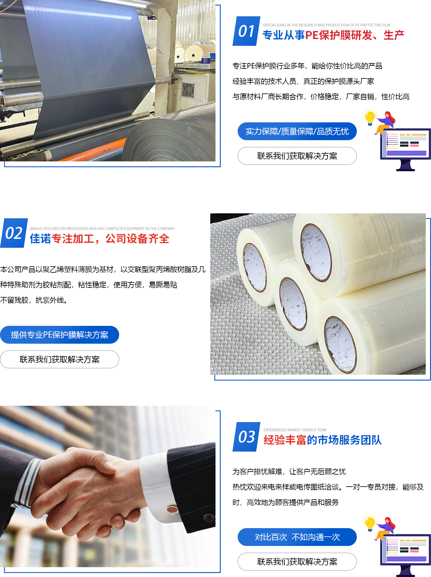 德州佳諾塑業(yè)有限公司生產(chǎn)防靜電自粘膜,包裝膜,筒子膜,原模,各種PE保護(hù)膜以及保護(hù)膜基材。公司生產(chǎn)保護(hù)膜、膠帶,是各類(lèi)不銹鋼板、彩鋼板、鋁塑板、防火板、塑鋼型材、裝飾板、有機(jī)玻璃制品、漆面板、鏡面板、外墻板,保溫板,石英石,大理石,人造石,瓷磚,防盜門(mén),木門(mén),不銹鋼門(mén)窗,各種裝飾面板,各種建筑板材、地毯,以及電子、家用電器、家具、汽車(chē)制造,等行業(yè)不可缺少的表面保護(hù)材料。使被貼物在運(yùn)輸、加工、貯存和使用過(guò)程中不受污染、腐蝕、劃傷,保護(hù)原有的光潔亮澤的表面,從而提高產(chǎn)品質(zhì)量。 本公司產(chǎn)品用于鋁型材,PVC等材質(zhì)型材保護(hù)膜,鋁門(mén)等鋁制品保護(hù)膜,鋁塑板,不繡鋼,鋁合金等產(chǎn)品表面保護(hù)膜,保護(hù)其在運(yùn)輸途中,生產(chǎn),安裝時(shí)對(duì)產(chǎn)品表面所造成的刮傷,灰塵等。可用于,汽車(chē)門(mén),木地板,冰箱表面等家電及電子產(chǎn)品表面的保護(hù)。 基材:PE材質(zhì) 粘性:低粘,中粘,高粘,特高粘 膜材:透明膜,藍(lán)膜,黑白膜,乳白膜 ( 除藍(lán)膜外,其...